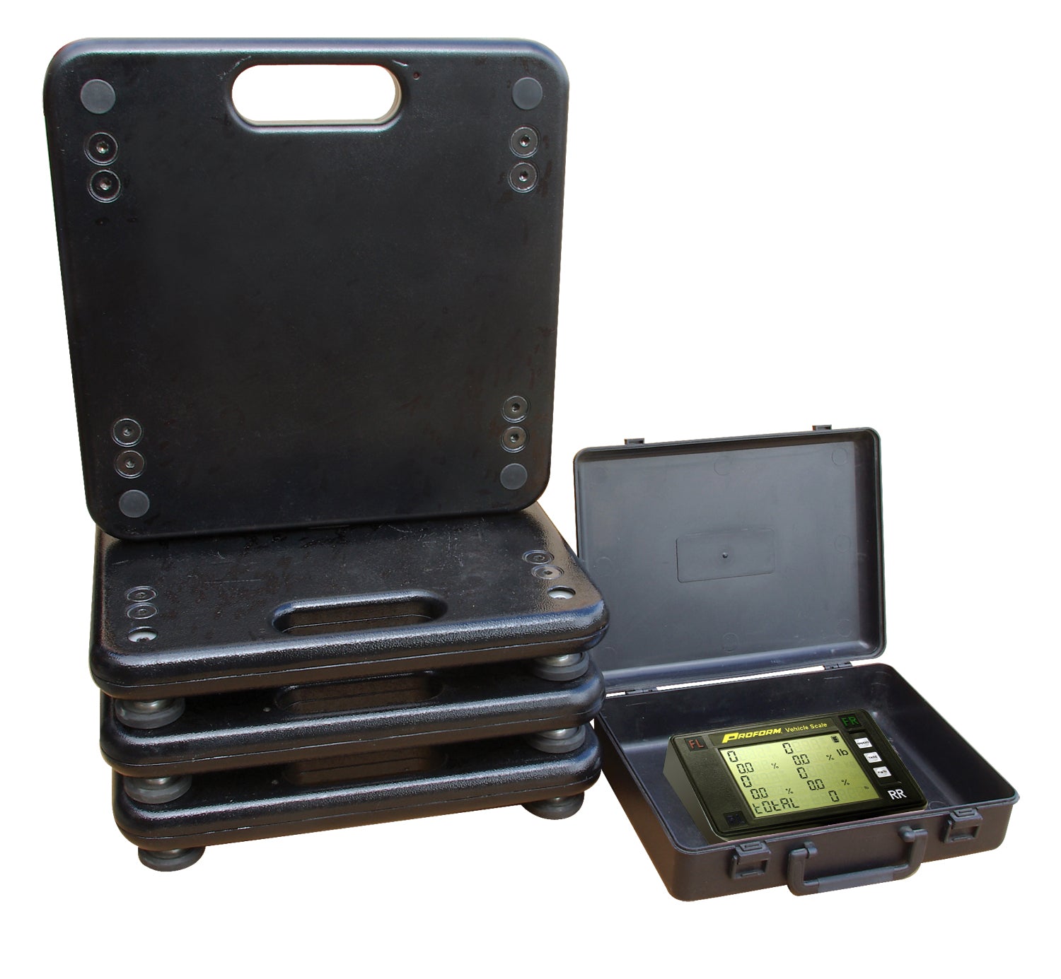The New PROFORM Wireless Vehicle Scales feature weight and percentage for each wheel, and total vehicle weight. The new lightweight, die-cast aluminum, scale pads are 15 inch x 15 inch with a 1,750 lb. capacity per pad for a total scale capacity of 7,000 lbs. Each scale pad has four stud mounted self-stabilizing feet. Scale is accurate to 1/10 of 1 percent. The scale also comes with a LCD display powered by 4 AA batteries; durable carrying case with wheels; front and rear percentages; over-sized, easy to read display characters. Batteries included. Sold as a set.